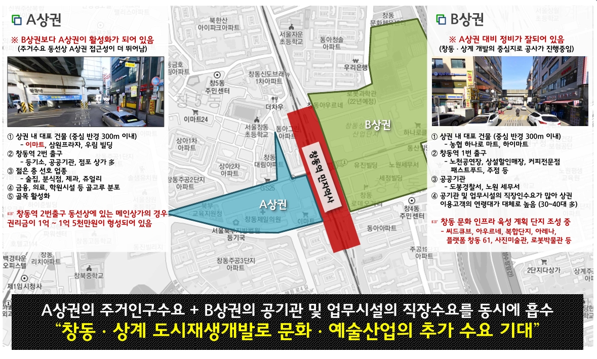 역세권과 연계한 상권이라는 점과 고정적인 배후수요가 많다는 점, 중심상권의 랜드마크급 이미지를 구축하는 점 등을 고려할 때 우수한 상품 여건을 보이고 있으며 도봉구의 1.3%밖에 되지 않은 상업용지 비율을 점유했다는 높은 희소가치도 보이고 있습니다.